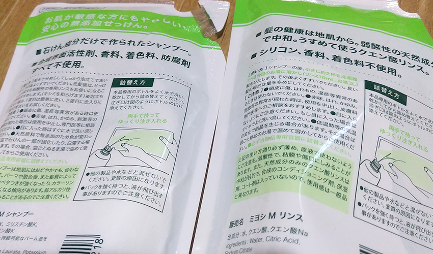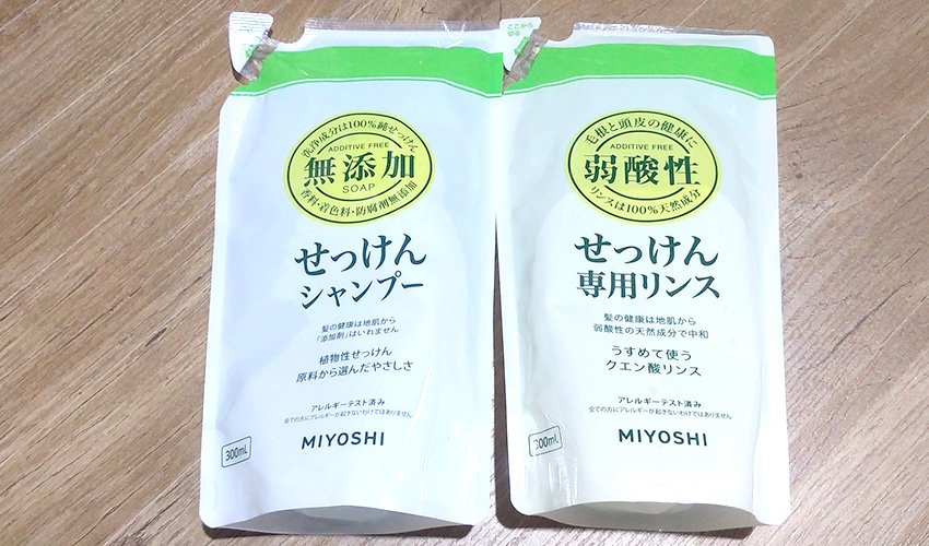 色々試した結果ミヨシの「せっけんシャンプーとリンス」に落ち着いた
