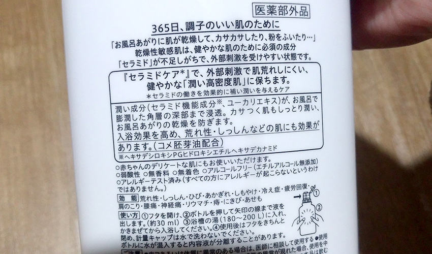 色は乳白色で、入れると白っぽいお湯になります。ちょっとぬるぬるして滑りやすくなるので、注意が必要です。